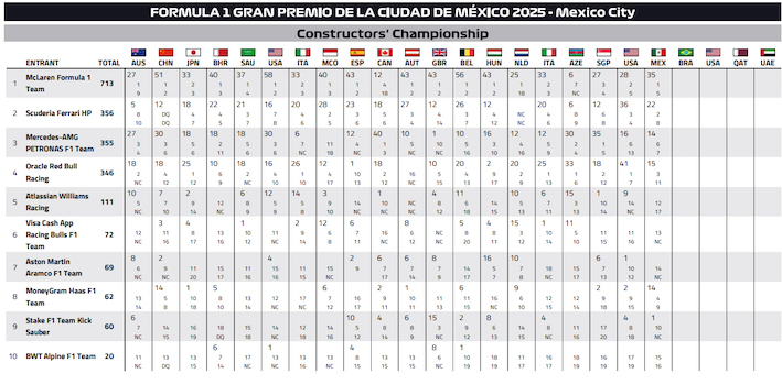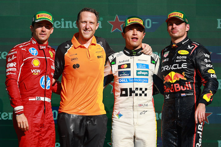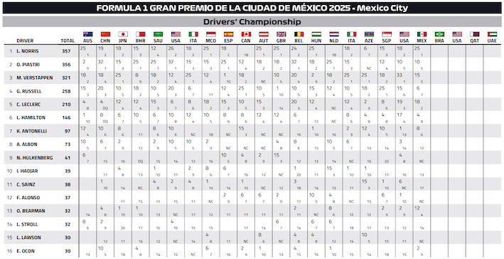 Η αγωνία τώρα κορυφώνεται στο πρωτάθλημα οδηγών, με 4 Grand Prix και 2 Sprint να απομένουν. Ο Λάντο Νόρις πέρασε στην κορυφή της βαθμολογίας, μόλις έναν βαθμό μπροστά από τον Όσκαρ Πιάστρι, ενώ ο Μαξ Φερστάπεν βρίσκεται πλέον 36 βαθμούς πίσω από τον πρωτοπόρο. Απομένουν 116 βαθμοί να μοιραστούν, οπότε όλα τα ενδεχόμενα παραμένουν ανοιχτά. Τόσο ο Νόρις όσο και ο Πιάστρι έχουν τη δυνατότητα να τερματίζουν δεύτεροι πίσω από τον Φερστάπεν και να παραμείνουν μπροστά του έως το τέλος – όμως αυτό δεν μπορούν να το κάνουν και οι δύο ταυτόχρονα. Το γεγονός αυτό αφήνει περιθώριο στον Ολλανδό πρωταθλητή να επωφεληθεί από την εσωτερική μάχη των δύο οδηγών της McLaren στους τελευταίους αγώνες της χρονιάς.