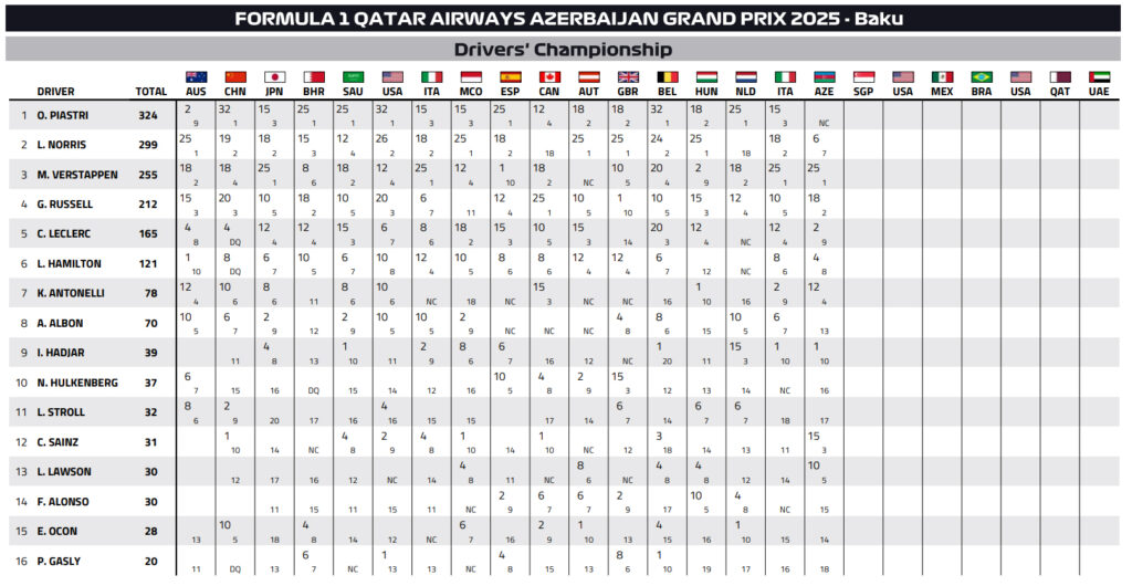 Η τελική κατάταξη του 17ου Grand Prix στο Αζερμπαϊτζάν έχει ως εξής: