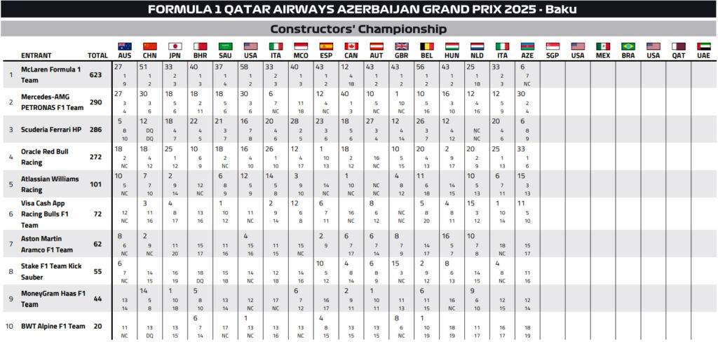 Όσον αφορά στην απόδοση των ομάδων, η McLaren προβλημάτισε καθώς δεν είχε την ταχύτητα να κερδίσει θέσεις. Μετά την έξοδο του Πιάστρι στην αρχή, ο Νόρις έμεινε στις πιο πίσω θέσεις. Οι Ferrari απογοήτευσαν για έναν ακόμη αγώνα, σε αντίθεση με τις Mercedes που κατάφεραν να μαζέψουν 30 βαθμούς και να περάσουν τους «κόκκινους», ανεβαίνοντας στη 2η θέση στη βαθμολογία του πρωταθλήματος κατασκευαστών. Την ίδια στιγμή ο Νόρις μείωσε τη διαφορά του από τον Πιάστρι στους 25 βαθμούς, ενώ ο Φερστάπεν μπήκε στο παιχνίδι καθώς απέχει 69 βαθμούς από την κορυφή, με 199 να απομένουν να μοιραστούν σε 7 αγώνες.