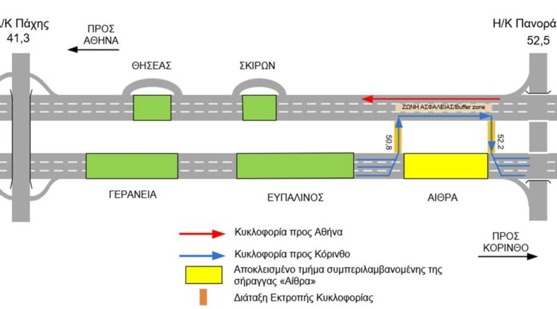 - Η κυκλοφορία προς Κόρινθο θα διεξάγεται μέσω της αριστερής λωρίδας του αντίθετου ρεύματος (προς Αθήνα).