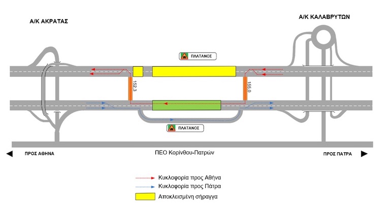Κατά τη διάρκεια των εργασιών, ο κλάδος προς Αθήνα θα παραμείνει κλειστός και η κυκλοφορία θα εκτρέπεται στο ρεύμα προς Πάτρα μέσω των Ανοιγμάτων Έκτακτης Ανάγκης, στο τμήμα από τη Χ.Θ. 155,00 έως τη Χ.Θ. 152,30. Η κυκλοφορία προς Πάτρα θα διεξάγεται μέσω της παράπλευρης βοηθητικής οδού βόρεια των σηράγγων.