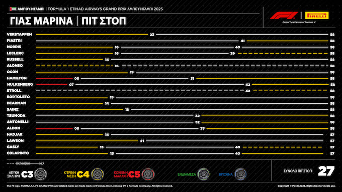 Ο Norris επέλεξε δύο pit stops, ξεκινώντας με τη μέση γόμα και συνεχίζοντας με δύο φρέσκα σετ σκληρών, μια στρατηγική που αποδείχθηκε καθοριστική. Ο Piastri και ο Verstappen ακολούθησαν διαφορετικές μονο-στατικές προσεγγίσεις, όμως ο ρυθμός και η συνέπεια του Norris του χάρισαν το βάθρο και τον τίτλο — με διαφορά μόλις δύο βαθμών.