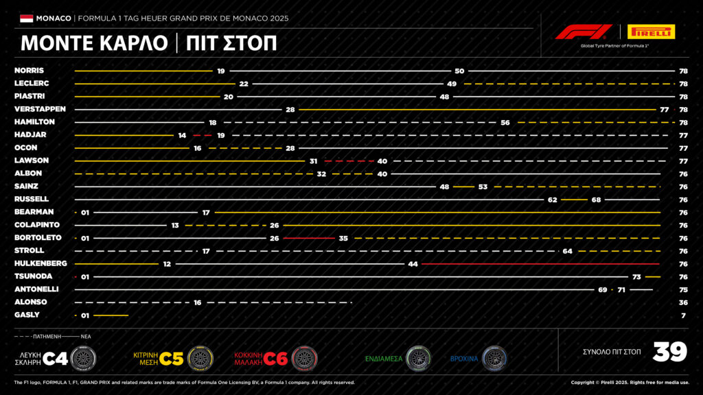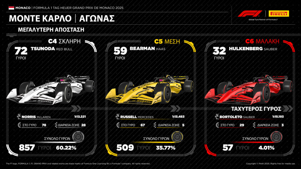 Ειλικρινά, νομίζω ότι, οι θεατές στην πίστα και όσοι παρακολουθούσαν στην τηλεόραση, ακόμα κι αν δεν ψυχαγωγήθηκαν σε μεγάλο βαθμό, σίγουρα δεν βαρέθηκαν, κάτι που συμβαίνει συχνά σε αγώνες που δεν έχουν επηρεαστεί από ασυνήθιστες συνθήκες όπως βροχή ή αυτοκίνητα ασφαλείας. Στο τέλος, αυτό είναι το Mονακό, είτε το δέχεσαι είτε όχι: κατατακτήριες που σου κόβουν την ανάσα και αγώνας όπου οι προσπεράσεις είναι σχεδόν αδύνατες. Μόνο μετά από προσεκτική ανάλυση του αγώνα, μπορούν όλοι οι εμπλεκόμενοι να δώσουν μια ακριβή ετυμηγορία για αυτό το πείραμα. Στον τομέα των ελαστικών, όπως αναμενόταν, η μέση και η σκληρή γόμα χρησιμοποιήθηκαν περισσότερο. Αμφότερες αποδείχθηκαν ικανές να καλύψουν σχεδόν ολόκληρη την απόσταση του αγώνα χωρίς την ανάγκη για αλλαγή. Είναι πιθανό η μέση γόμα να απαιτούσε λίγο περισσότερη διαχείριση, αλλά συνολικά, το επίπεδο φθοράς της ήταν κάτι παραπάνω από αποδεκτό. Αυτό το Σαββατοκύριακο η μαλακή γόμα C6 αποδείχθηκε ένα καλό ελαστικό για τις κατατακτήριες, αλλά πάνω απ’ όλα, έπαιξε έναν τακτικό ρόλο, ωθώντας προφανώς τις ομάδες να χρησιμοποιήσουν περισσότερο τη μέση γόμα. Ας μην ξεχνάμε ότι αυτό το ελαστικό ήταν πέρυσι η μαλακή γόμα. Αυτός ήταν ακριβώς ο στόχος μας και αναμένουμε με μεγάλο ενδιαφέρον να δούμε, πώς θα αποδώσει και σε μια άλλη διαδρομή, αυτή του Μόντρεαλ».