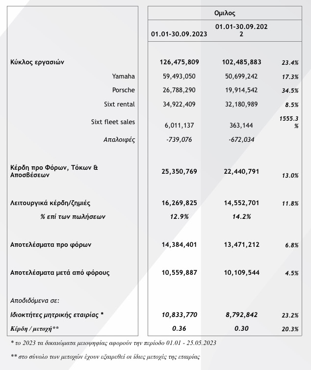 Ο όμιλος Μοτοδυναμική συνεχίζει την πορεία που έχει χαράξει τα τελευταία χρόνια με σημαντική ανάπτυξη σε όλα τα μεγέθη για το ενιάμηνο 01.01 – 30.09.2023.
