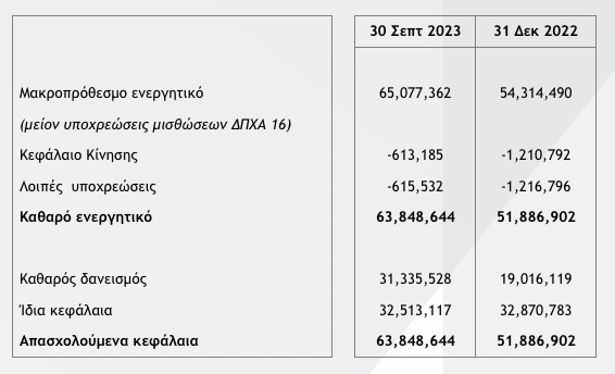 Κατά το ενιάμηνο του 2023, το μακροπρόθεσμο ενεργητικό του Ομίλου (εξαιρώντας την επίδραση του ΔΠΧΑ 16) ανήλθε στα 65,1 εκ. ευρώ παρουσιάζοντας αύξηση 19,8% έναντι του 2022. Η αύξηση οφείλεται κυρίως στις επενδύσεις σε στόλο της SIXT.