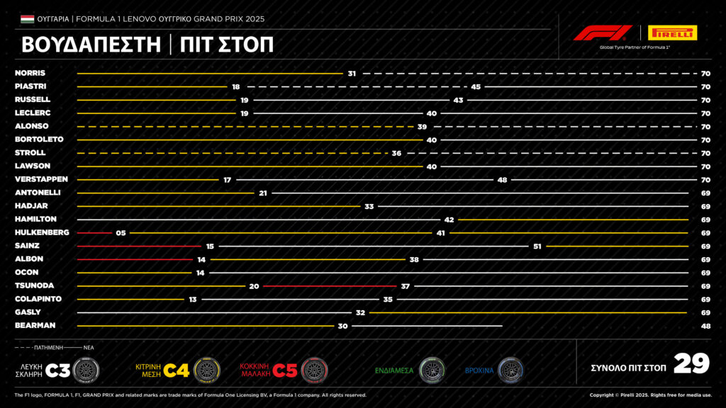 «Το πρώτο μισό της σεζόν ολοκληρώθηκε με έναν πολύ ενδιαφέρον αγώνα, με τρεις οδηγούς να μάχονται για τη νίκη. Στο τέλος, ο Norris πήρε τη νίκη, κερδίζοντας οριακά τον team-mate του, Piastri. Οι δύο οδηγοί της McLaren ακολούθησαν διαφορετικές στρατηγικές. Ο Άγγλος επέλεξε μία στάση, ενώ ο Αυστραλός δύο. Θεωρητικά, η στρατηγική των δύο στάσεων ήταν πιο γρήγορη, αλλά η χαμηλότερη θερμοκρασία – περίπου δέκα βαθμούς- σε σύγκριση με τις ελεύθερες δοκιμές της Παρασκευής, περιόρισε ελαφρώς τη διαφορά μεταξύ των δύο επιλογών. Αυτό συνέβη επειδή η θερμική υποβάθμιση μειώθηκε και για τις τρεις γόμες σε σχέση με ό,τι είδαμε στις ελεύθερες δοκιμές. Ειλικρινά, εξακολουθούσαμε να πιστεύουμε ότι η στρατηγική των δύο στάσεων ήταν η καλύτερη, αρκεί να δούμε τη διαφορά που είχε ο Alonso, στην πέμπτη θέση, σε σχέση με τον Russell. Η εξαίρεση ήταν ο Norris, ο οποίος επέλεξε να κάνει μόνο μία στάση, αφού βρέθηκε στην πέμπτη θέση μετά τον πρώτο γύρο. Η μικρή διαφορά απόδοσης μεταξύ της μέσης και της σκληρής γόμας, σε συνδυασμό με τη σαφή δυσκολία στο προσπέρασμα, καθώς τα μονοθέσια είχαν παρόμοιο ρυθμό αγώνα, έκαναν το ρίσκο μιας ανορθόδοξης στρατηγικής να αξίζει, επειδή σε εκείνο το σημείο δεν είχε τίποτα να χάσει.