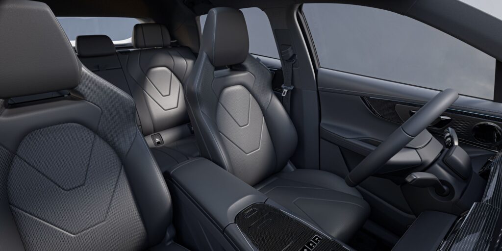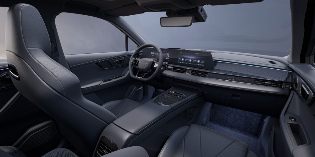Ανοίγοντας την πόρτα, η πρώτη εντύπωση είναι πως η καμπίνα δεν προδίδει το νεαρό της μάρκας. Το ταμπλό έχει καθαρές γραμμές, με δύο ενωμένες οθόνες 10,25 ιντσών που σχηματίζουν ένα ενιαίο πάνελ – διάταξη που θυμίζει premium κατασκευαστές. Η ποιότητα των υλικών είναι καλή για την κατηγορία: μαλακές επενδύσεις στο επάνω μέρος, καλή συναρμογή και μόνο λίγα σκληρά πλαστικά χαμηλότερα, χωρίς ωστόσο να ενοχλούν αισθητικά. Η θέση οδήγησης είναι ευχάριστη, με σωστή εργονομία και εύκολα προσβάσιμους διακόπτες για τα βασικά χειριστήρια.